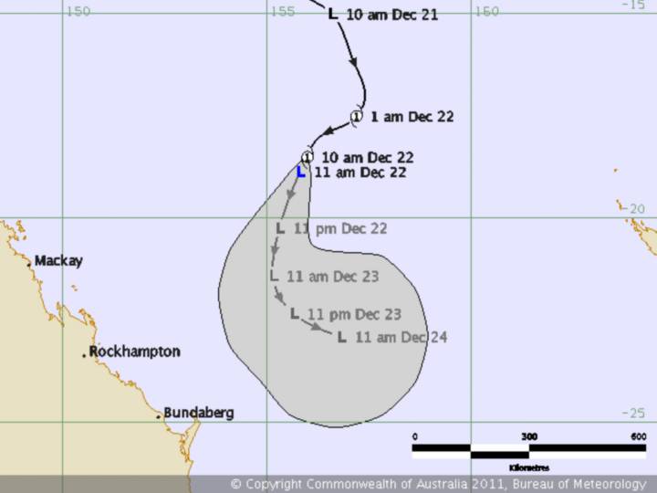 Cuando nosotros recalamos en Australia, lo hicimos en el estado de Queensland, concretamente en la ciudad de Bundaberg en el mes de Noviembre de 2011. Y precisamente estando amarrados a la Marina de Bundaberg, fuimos espectadores de la formación y evolución de una tormenta tropical, que suele ser el primer estadio en la creación de un huracán. La imagen corresponde al día 22 de Diciembre de 2011 y está editada por el Servicio Estatal Meteorológico de Australia. En ella se pueden observar dos áreas indicadas con un círculo que contiene una L (baja, low, presión) Estos puntos corresponden a dos formaciones de bajas presiones, bien organizadas y con todas las características para transformarse en huracán. A la baja situada al Este del estado de Queensland, le pusieron el nombre de Fina y fue el primer fenómeno tropical de la nueva temporada.